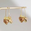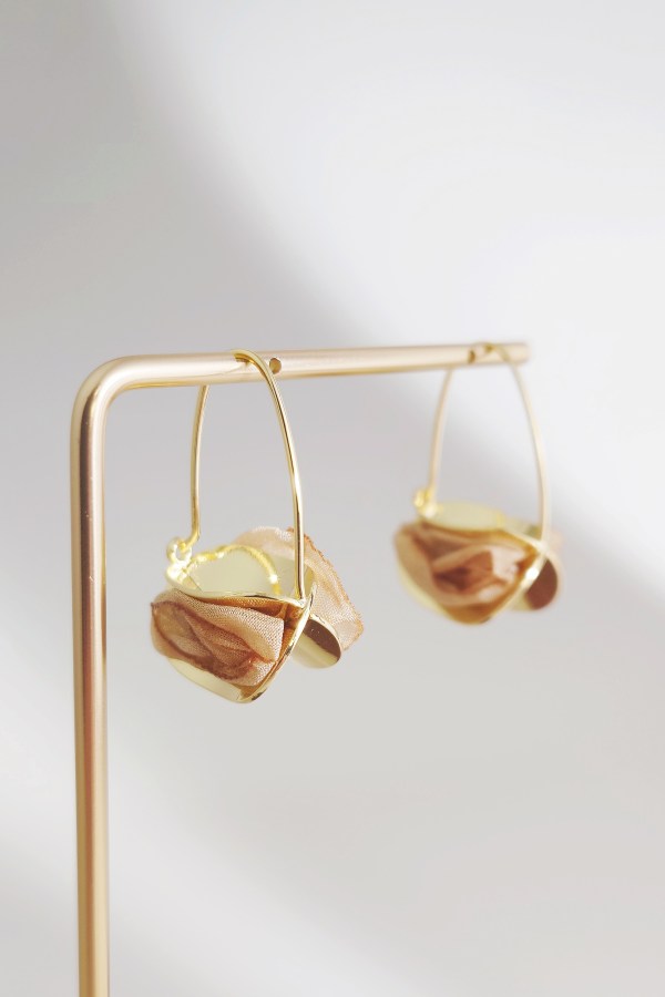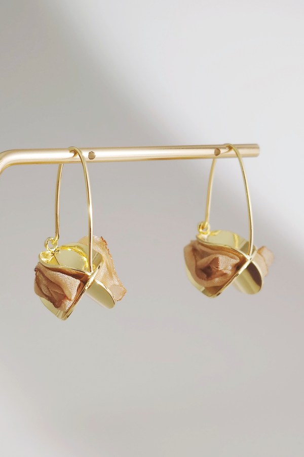 These unique drop earrings blend polished gold metal with delicate sheer fabric, striking a perfect balance between metallic sheen and soft, airy warmth. The lightweight design sways gracefully with every movement, adding a playful, dynamic charm to your look. Ideal for elevating everyday style or special occasions, they merge modern edge with gentle femininity for an unforgettable, whimsical allure.