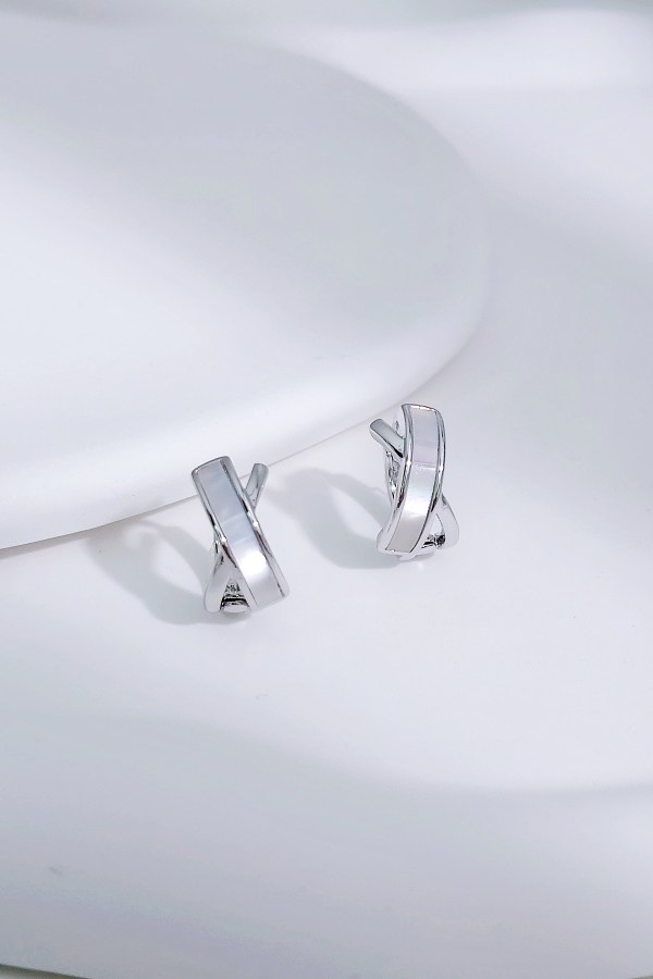 These delicate small hoop earrings are crafted from copper with a rhodium plating, boasting a sleek, long-lasting shine. Each earring features a smooth shell inlay that wraps elegantly around the hoop, creating a modern interwoven design. Compact and lightweight, they blend minimalist metal lines with the soft luster of shell, making them a versatile accessory for everyday wear and refined layering.