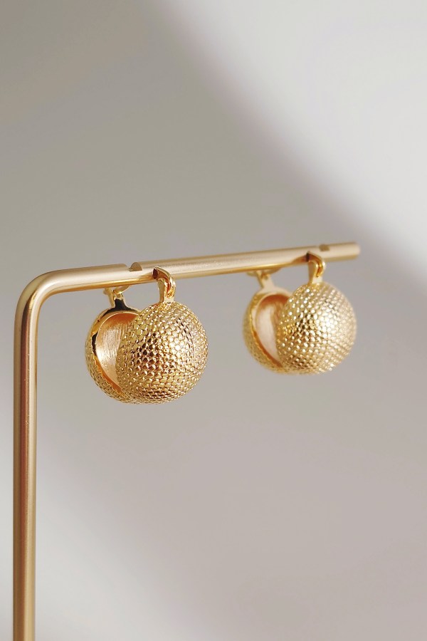These glamorous gold-toned drop earrings feature a striking spherical pendant with a richly textured, hammered surface that catches the light to create a subtle, warm shimmer. The smooth, polished hoop base pairs perfectly with the tactile, dimpled finish of the orb, balancing modern minimalism with artisanal charm.