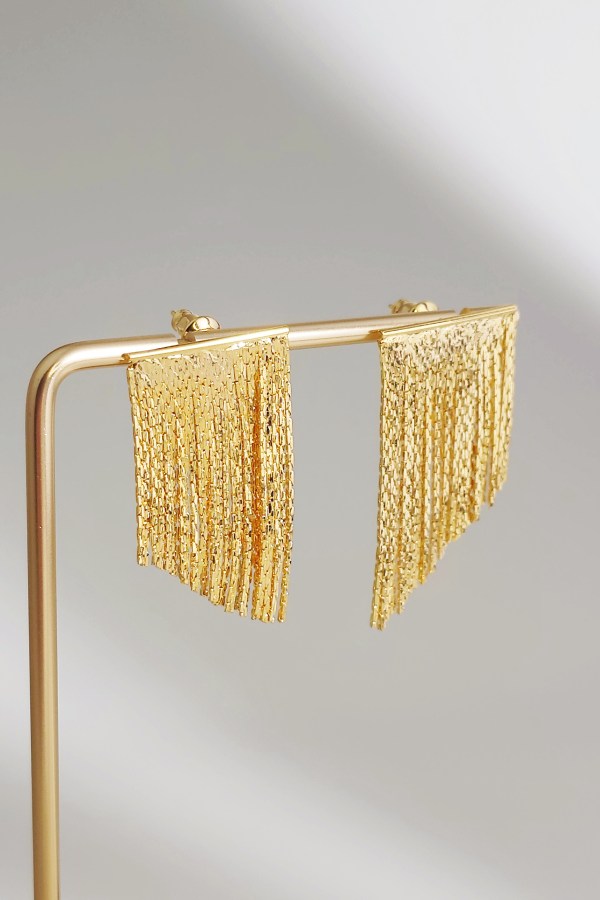 Deze gedurfde, glamoureuze gouden franjesoorbellen stralen vrouwelijke allure uit met vallende, sprankelende kwastjes die bij elke beweging het licht opvangen. Gemaakt met een hoogglans metaalafwerking, voegt hun dramatische, vloeiende ontwerp direct verfijning en drama toe aan elke look. Perfect voor speciale gelegenheden, ze zijn het ultieme statementstuk om je outfit te verheffen met tijdloze elegantie en opvallende glamour.
