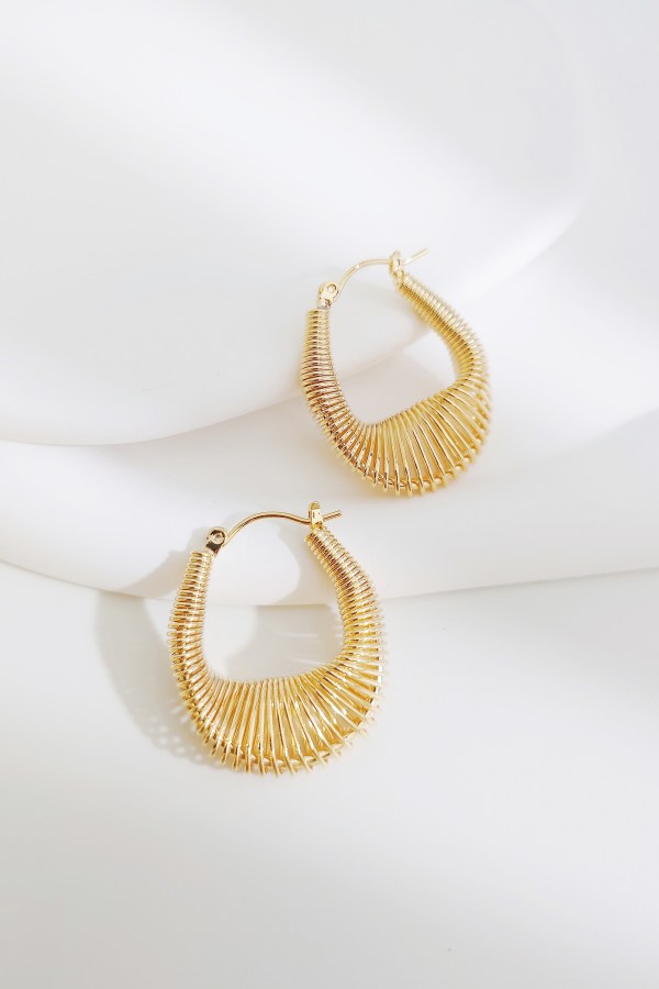 These gold-toned hoop earrings boast a striking, wave silhouette, crafted from fine layered metal wires that radiate outward in a dynamic, textured pattern. The open, edgy shape blends architectural edge with delicate artistry, catching light to create a luminous, rippling effect. Bold yet lightweight, they reimagine classic hoop style with modern sculptural flair, making them a statement piece for elevating any look.